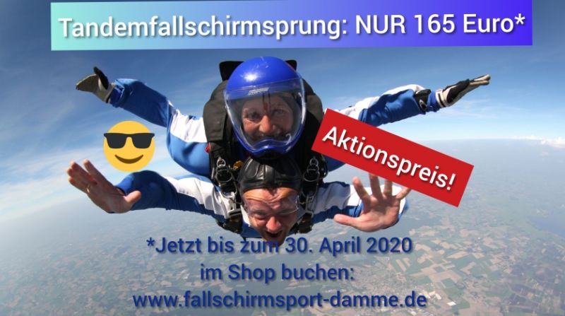 Um eure Laune in der aktuellen Lage zu heben, machen wir euch eine große Freude: Bis zum 30. April 2020 könnt ihr in unserem Shop einen Tandemfallschirmsprung für NUR 165 Euro buchen. Belohnt eure Geduld mit der Vorfreude auf einen ordentlichen Adrenalinkick. Jetzt den Aktionspreis sichern und später dann aus dem Flugzeug springen! Versprochen: Das Lächeln hält verdammt lange an! Aber Vorsicht: Suchtgefahr!